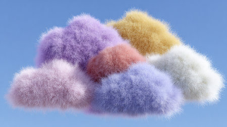 Multiple fluffy clouds of various pastel colors, such as light purple, light pink, light beige, and light blue, are positioned against a clear light blue sky. The clouds have a dense, fuzzy texture, resembling fur, and are in a grouping. The image evokes a sense of whimsy and creativity.
