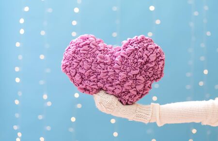 Fluffy pastel heart cushions on pink surface, love and comfort concept
