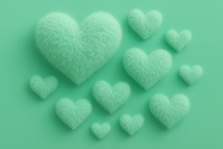 A visually appealing composition showcasing multiple heart shapes in varying sizes. Each heart features a delicate, textured surface, resembling soft felt or fine granular sugar, all rendered in a soothing mint green hue. The hearts are artfully arranged on a matching monochromatic background, with subtle shadows providing depth and dimension. This charming visual evokes feelings of tenderness, affection, and sweet sentiment, perfect for themes of love, romance, or gentle celebration. The refreshing color palette contributes to a tranquil and pleasant atmosphere.