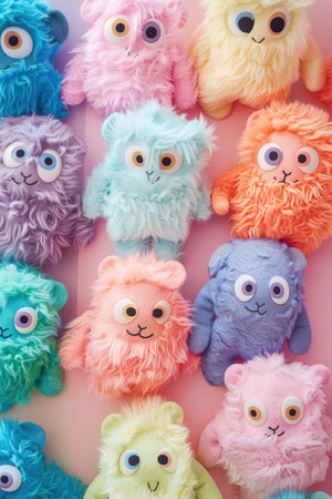 Adorable fluffy plush toys in vibrant colors, close-up view