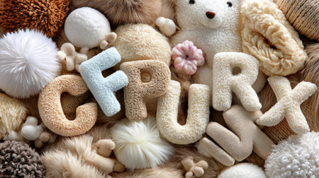 A vibrant arrangement of plush letters surrounded by various soft textures and colors. Ideal for children's room decor, crafting projects, and textile art inspirations.