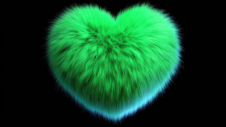 A vibrant green heart, rendered with a soft, furry texture, is displayed against a stark black backdrop. The heart shape dominates the composition, its fluffy appearance emphasized by the lighting. This image evokes feelings of softness and is suitable for various commercial uses, including designs related to love and affection.