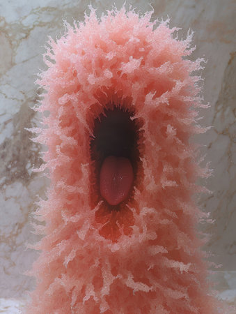 Abstract pink organic structure with a dark opening and red interior.