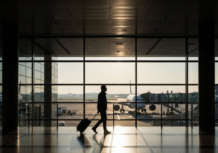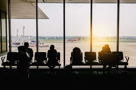 Silhouettes of business people traveling on airport; waiting at the plane boarding gates.