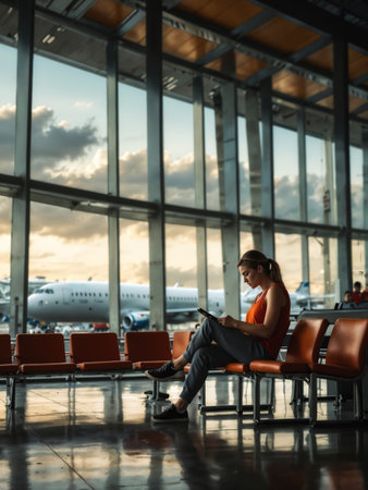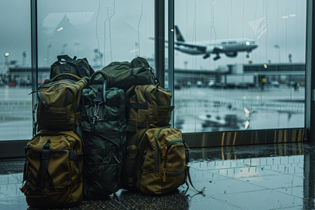 Several tote bags resting on empty seats in an airport terminal, overlooking a tarmac with airplanes at sunset, creating a serene and anticipatory atmosphere