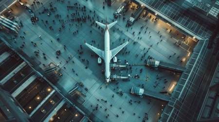 Overhead shot of a commercial jet at an airport gate surrounded by bustling activity of passengers and ground crew.