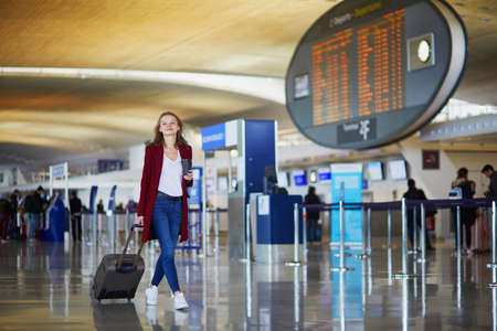 Close up of a young woman, alone, at the airport before a trip. Travel concept. Generative AI.