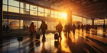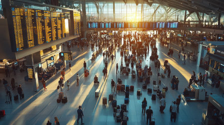 Busy airport terminal filled with travelers during peak arrival hours in early morning light