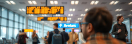 Crowd navigating vibrant airport terminal with high ceilings and flight banners