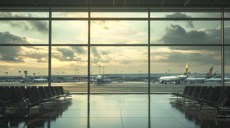 View of an empty airport terminal with sunlight pouring through large windows, an architectural shot with a view of airplanes.