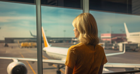 a woman is relaxing at the airport terminal with a coffee, waiting for her flight. she's enjoying the view of an airplane taking off vacation time