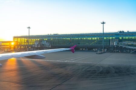 Tokyo Haneda International Airport in the sunrise time. Airplane wing with first light of morning. Tokyo, Japan