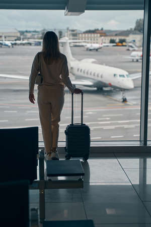 View on the aiport window with woman walking with suitcase at the departure hall during the sunset. Wide angle view with copy space.