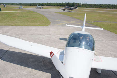 Small private single engine propeller airplane at regional airport.