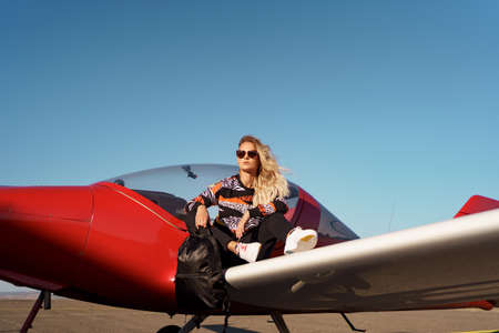 Young woman model with a modern haircut and fashionable sunglasses posing near a red plane wearing trendy casual outfit and black backpack