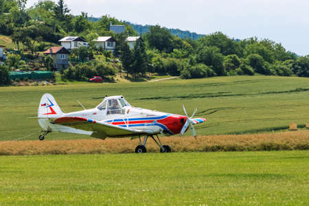 BRNO, CZECH REPUBLIC - JULY 4, 2021: Piper PA-25 Pawnee aircraft used by the Aeroklub Brno-Medlanky club as a towing aircraft for gliders.