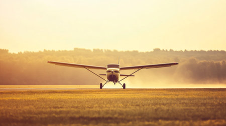 Propeller airplane taxiing on a grassy strip at sunrise, preparing for takeoff, surrounded by trees in the background and dust swirling in the morning light
