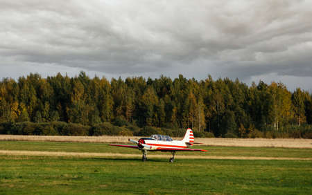 Sports light-engine airplane on the field against the sky with clouds. Sports aviation. Airplane
