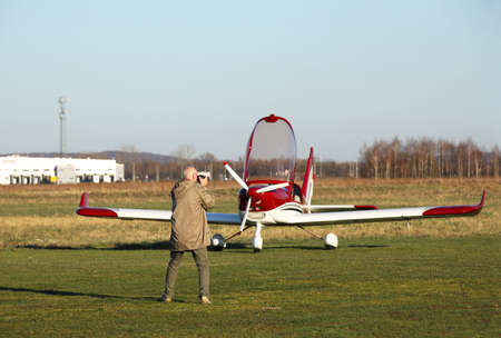 Yaslo, Poland - 7 9 2019: A man is photographing a red sports and tourist red turboprop airplane standing at a grass airfield. Free time at an air show. Private aviation for travel and entertainment.