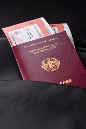 Passport Germany, visa for travel, document with tickets in travel bag. German passport as background for your design