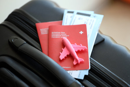 Swiss passport and avia tickets on travel bag. Pass and boarding tokens on bag close up. The concept of travel and vacation in Switzerland