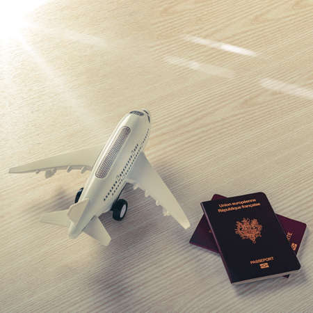 French passport and model plane placed on wooden table, closeup photo