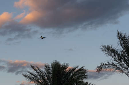 Plane in the sky. Shooted from the ground. Flying over the palm tree.