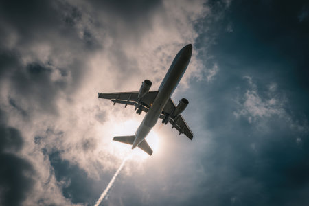 Airplane in a dramatic stormy sky, low angle, United Kingdom