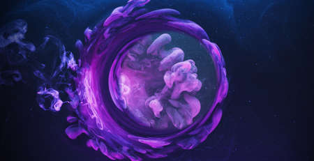 Ink water splash. Vapor cloud motion round portal. Logo reveal effect. Purple white color dye flow on dark black abstract art background shot on Red Cinema camera 6k.