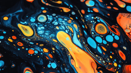 Macro view of swirling liquid with vibrant blue and orange hues and suspended bubbles.