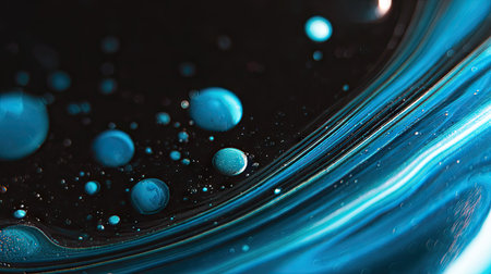 This image features a macro shot of fluid art with a mesmerizing blend of blue and black. The composition showcases swirling patterns and various sized circular forms. The textures and color gradients create visual interest. This artwork is suitable for use in design projects or as a background.