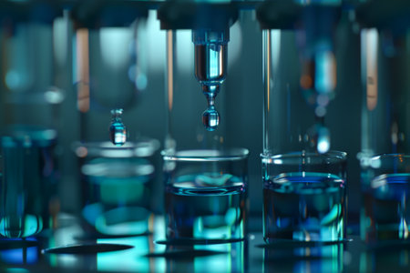 Under the bright lab lights, a precise stream of liquid gracefully drips from a microscope, revealing the delicate dance of scientific exploration and discovery.