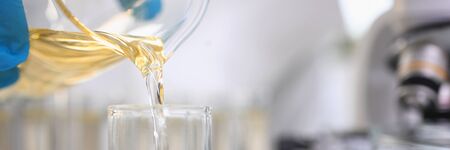 Close-up of laboratory worker hand holding flask and pouring yellow liquid in glassware. Preparing process before investigation. Developing medicine. Modern science concept