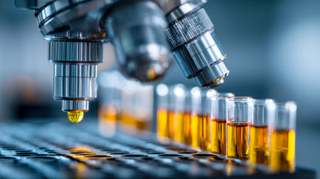 A precise microscope eye captures a droplet poised above tiny vials containing rich amber fluid, set against a softly blurred laboratory environment.