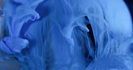 Blur fume explosion. Ink blob. Blue color dye dissolving underwater. Art kaleidoscopic prism drip trickles on abstract dark black background.