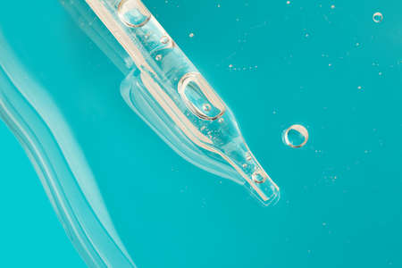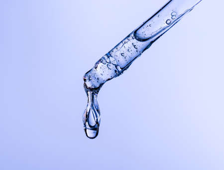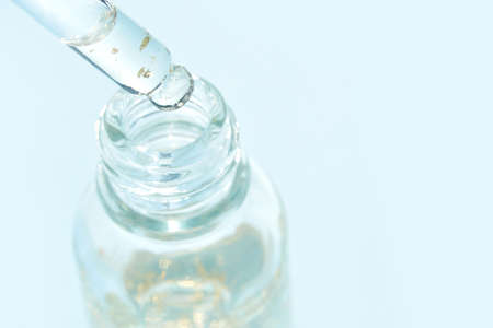 Pipette from dropper in the cosmetics gel.Top view,liquid cosmetic,macro photography.Blue banner with copy space.