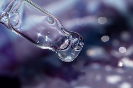 close up of face serum pipette in a fluid with glare on blue background for your beauty project