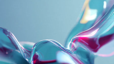 Close-up of colorful, translucent liquid waves in shades of blue and pink, showing smooth, flowing curves and shimmering reflections on a plain background.