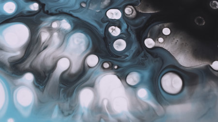 Bubble fluid. Oil liquid texture. Defocused dark black white paint in water round shiny drop spreading on abstract art background.