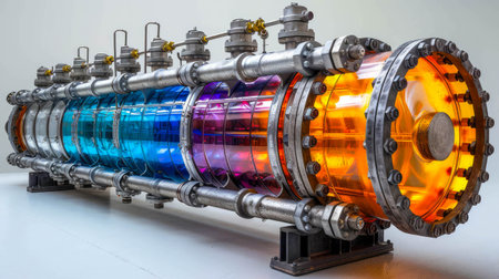 A futuristic industrial heat exchanger with polished metallic details, bolts, and mechanical components in a high-tech setting.