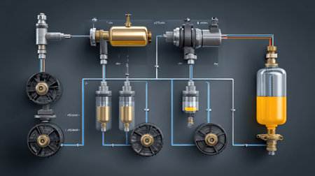 An intricate industrial pipe system showcasing valves and gauges designed for effective fluid control. Ideal for engineering or technical contexts.