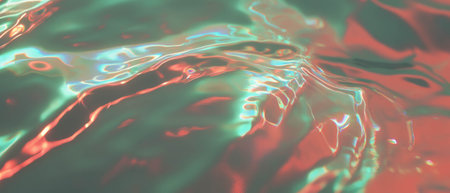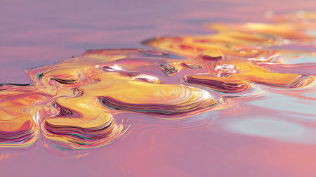 Abstract showing close-up of iridescent liquid surface with swirling rainbow colors and undulating wave-like...