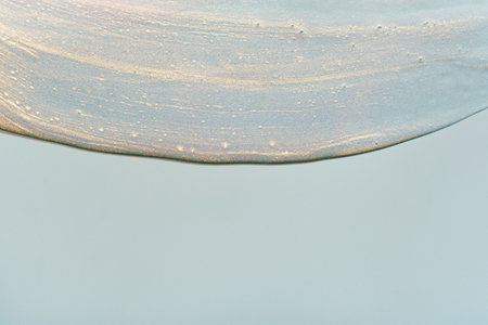Oil background. Blur droplets. Defocused blue white shiny glowing viscous ink texture paint water on abstract light art background.