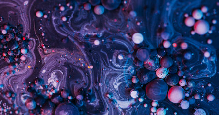Ink foam. Bubble fluid flow. Defocused blue purple color oil texture emulsion liquid wave on dark abstract art background.