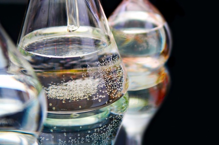 Glasses with chemical liquids are on a magnetic stirrer. Chemical laboratory. Shallow depth of field