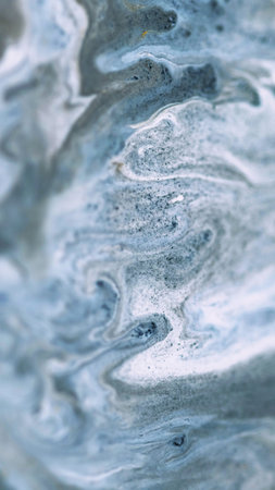 Liquid marble. Acrylic paint mix. Blur gray white color metallic blue golden sequin particles ink pigment dust emulsion fluid spill abstract art background.