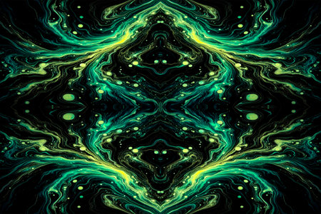 Fantastic kaleidoscopic pattern with neon colored chemical smoke on dark background. glow effect. digital illustration. 3d rendering