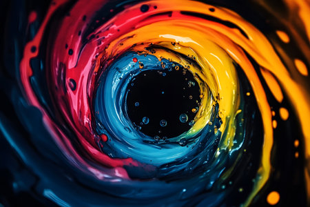 A captivating abstract composition features a swirling vortex of vibrant colors and fluid textures, creating a sense of movement and depth. The design draws in the viewer's gaze.