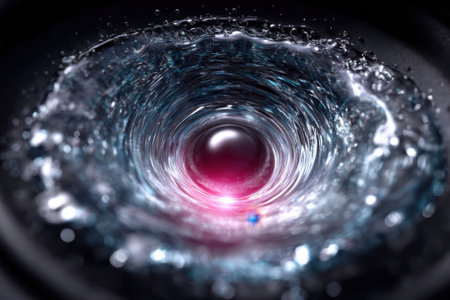 A circular vortex of water spins energetically, showing intricate designs and colorful reflections in darkness.