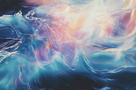 An abstract capture of water splashing in pastel pink and blue tones, creating a dreamy and artistic scene with fluid motion and textures.